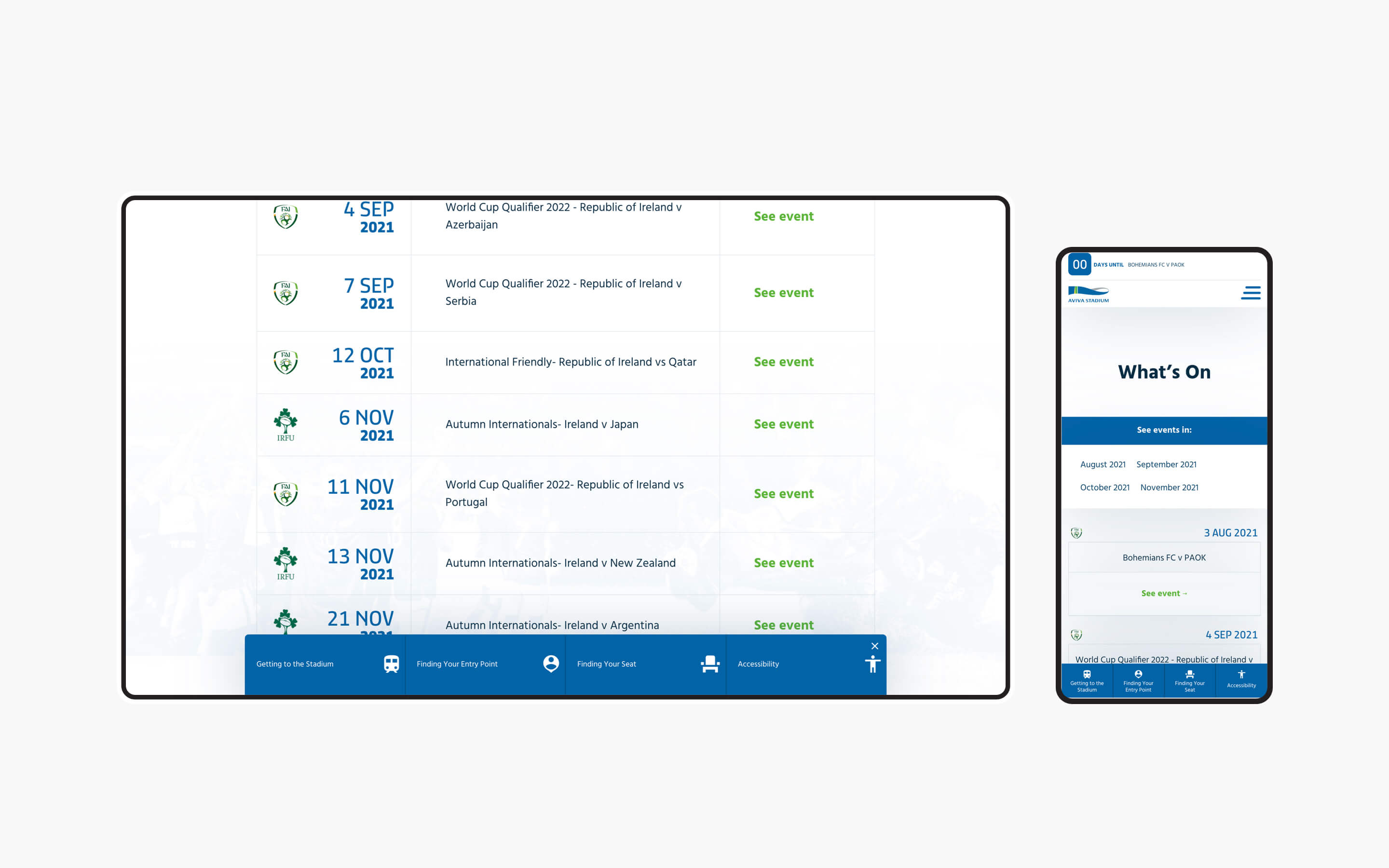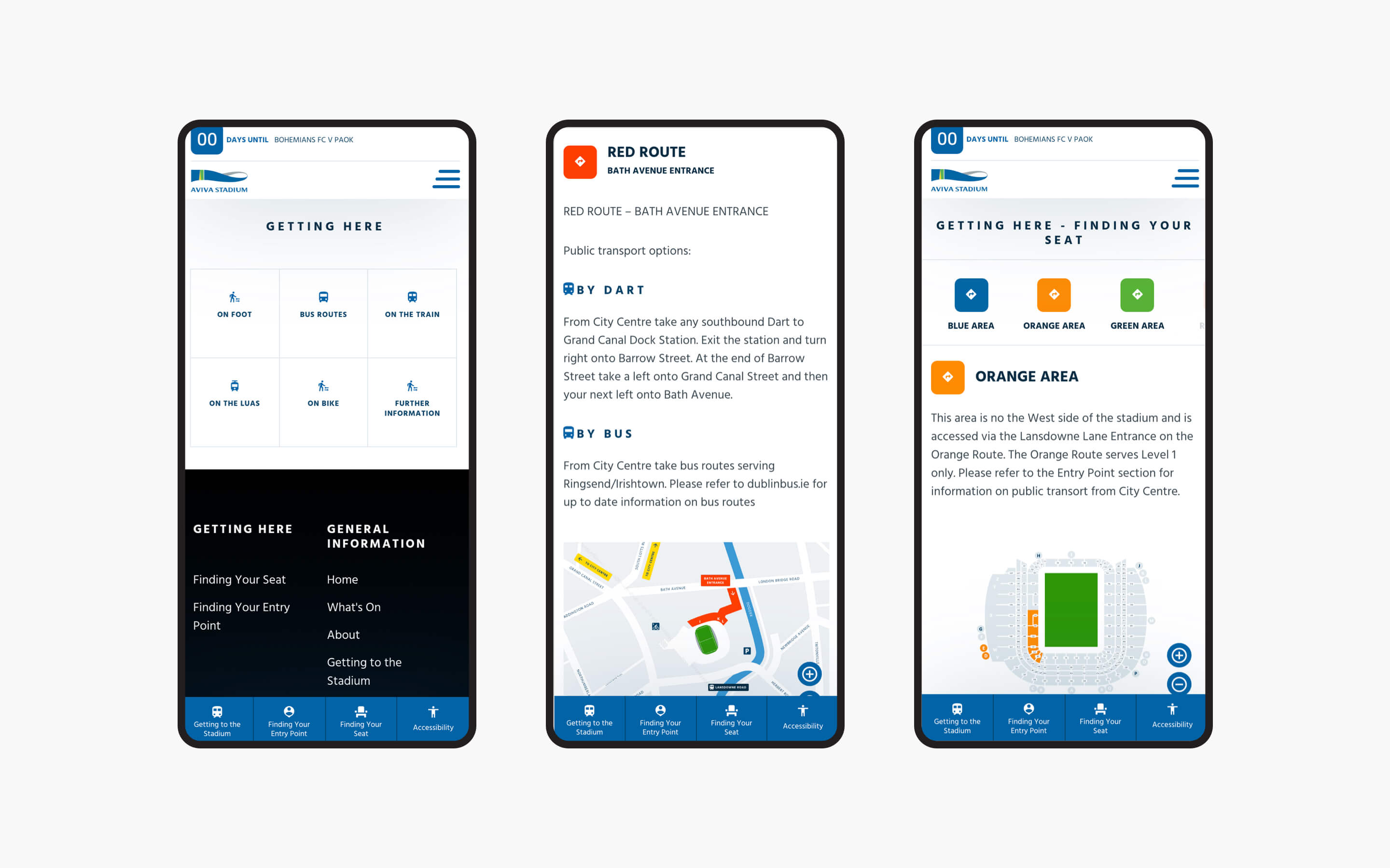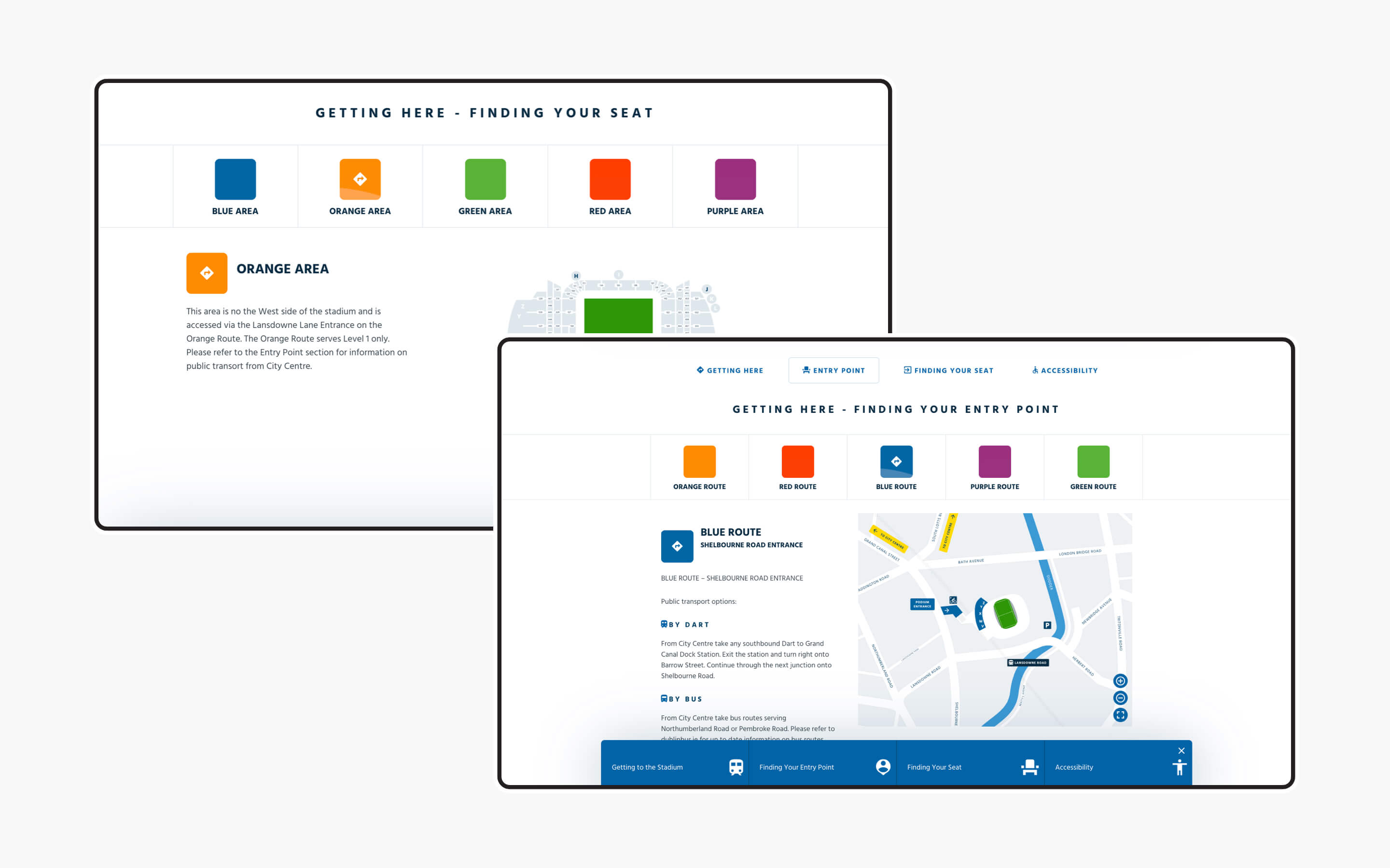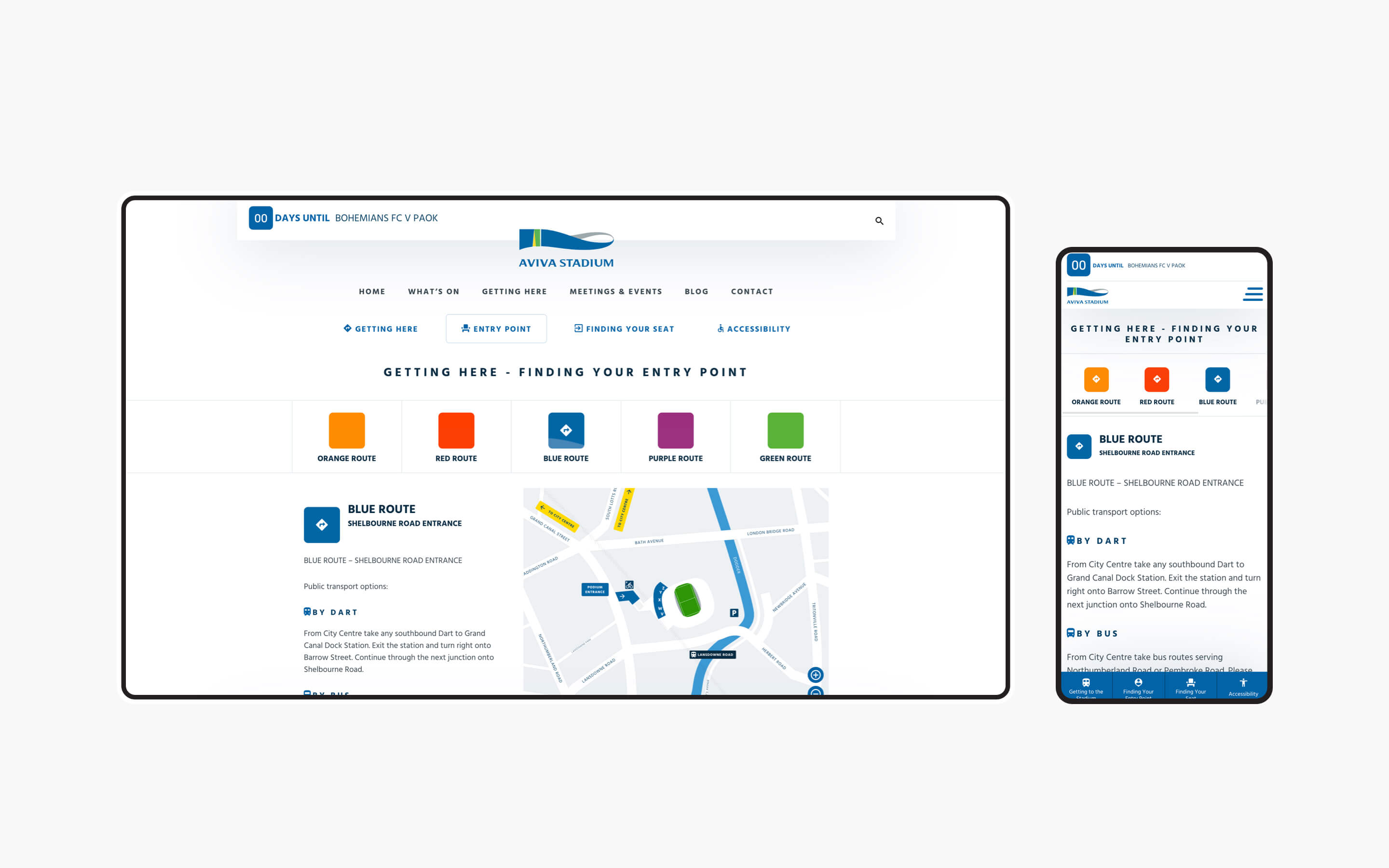 We designed and developed an interactive journey planner, plus colour-coded access maps optimised for mobile, within a dedicated area of the site. This in turn helps to reduce the requirement for stewarding and assistance during major fixtures and concerts without compromising the user experience on the day.