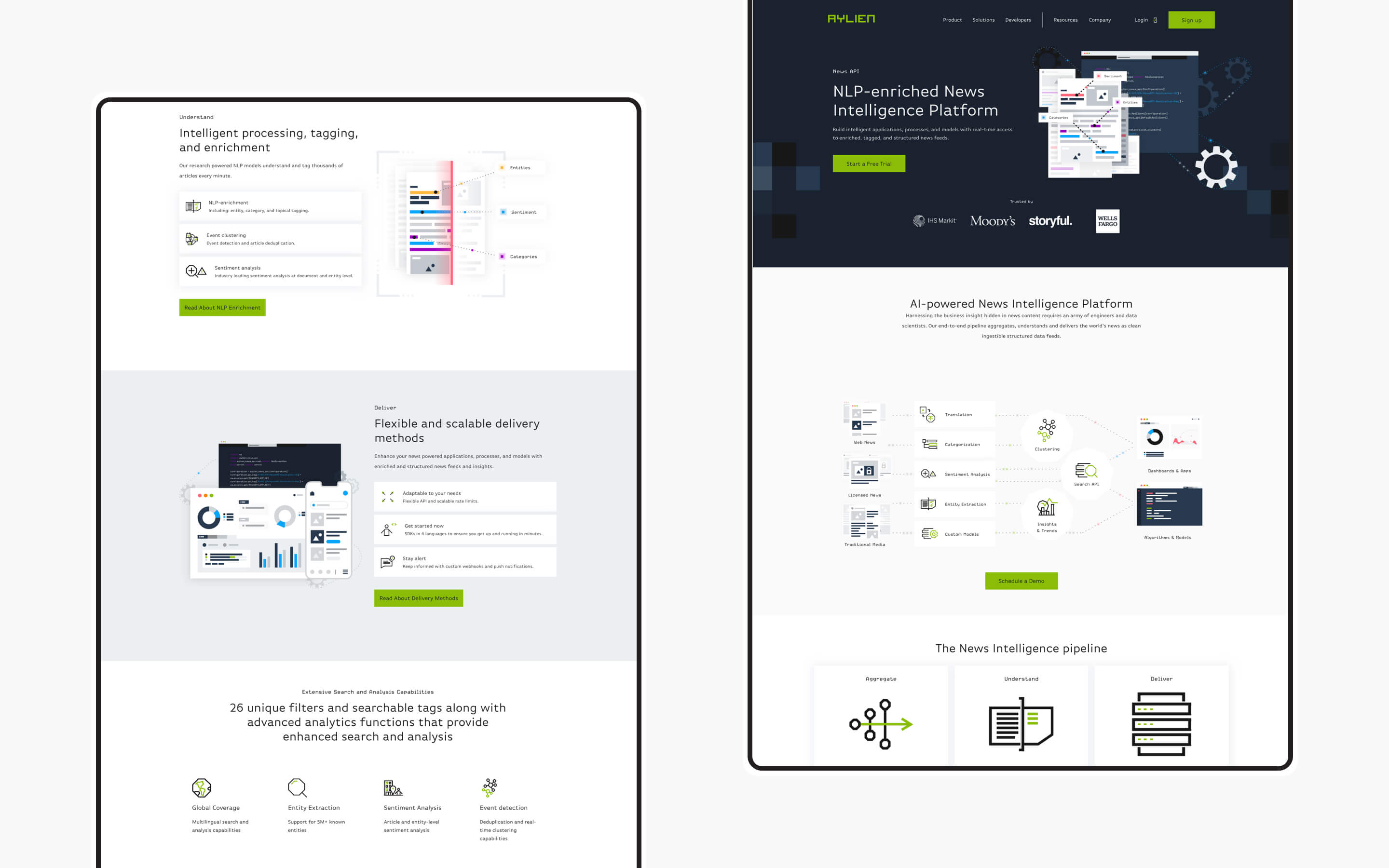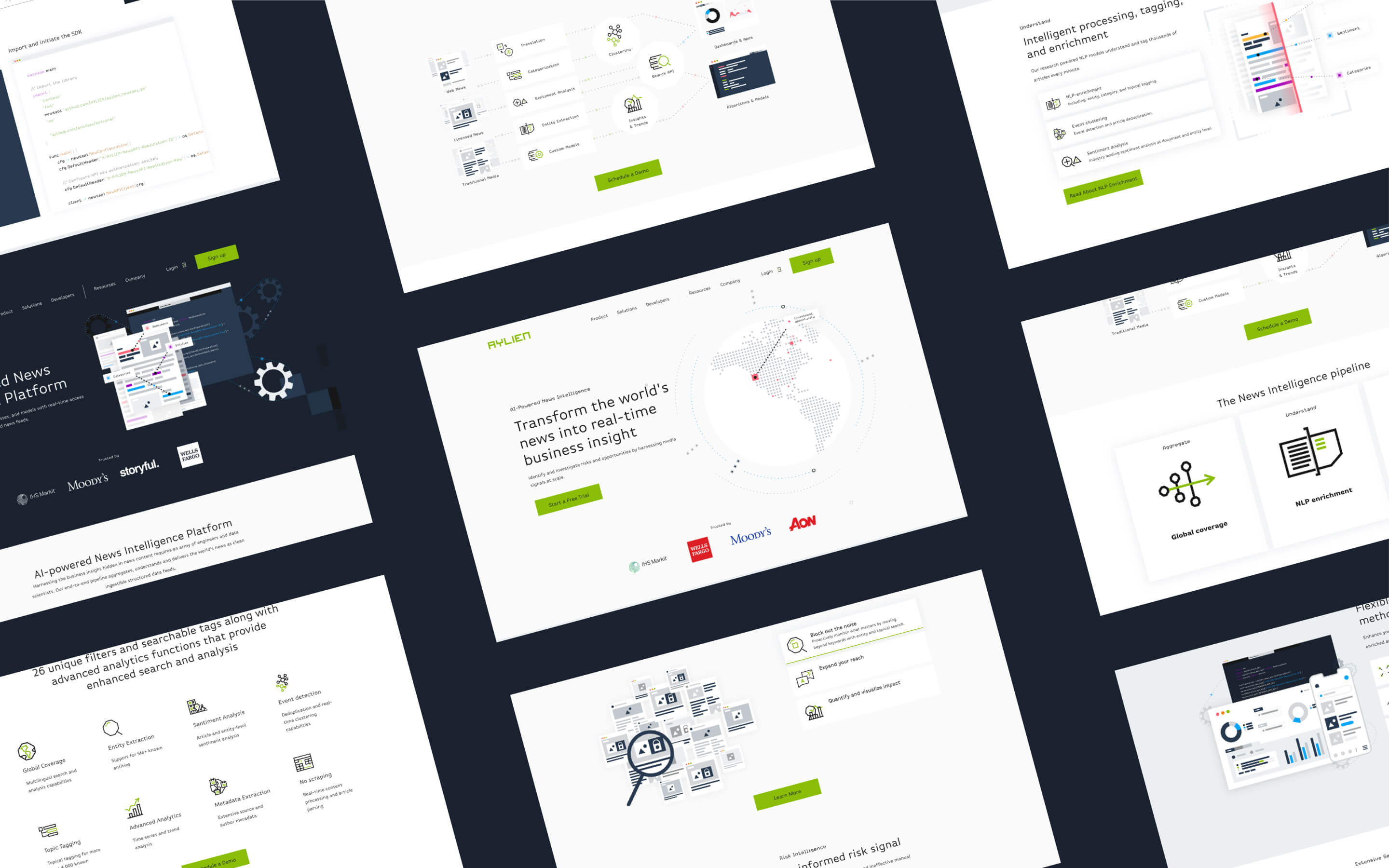 Aylien’s key offering transforms the world's news into real-time business insights, identifying and investigating risks and opportunities by harnessing media signals at scale. Kooba and Aylien are a perfect fit, and we relished transforming their online presence in 2019. Aylien was acquired by Quantexa in 2023 and Kooba no longer maintains the Aylien website.