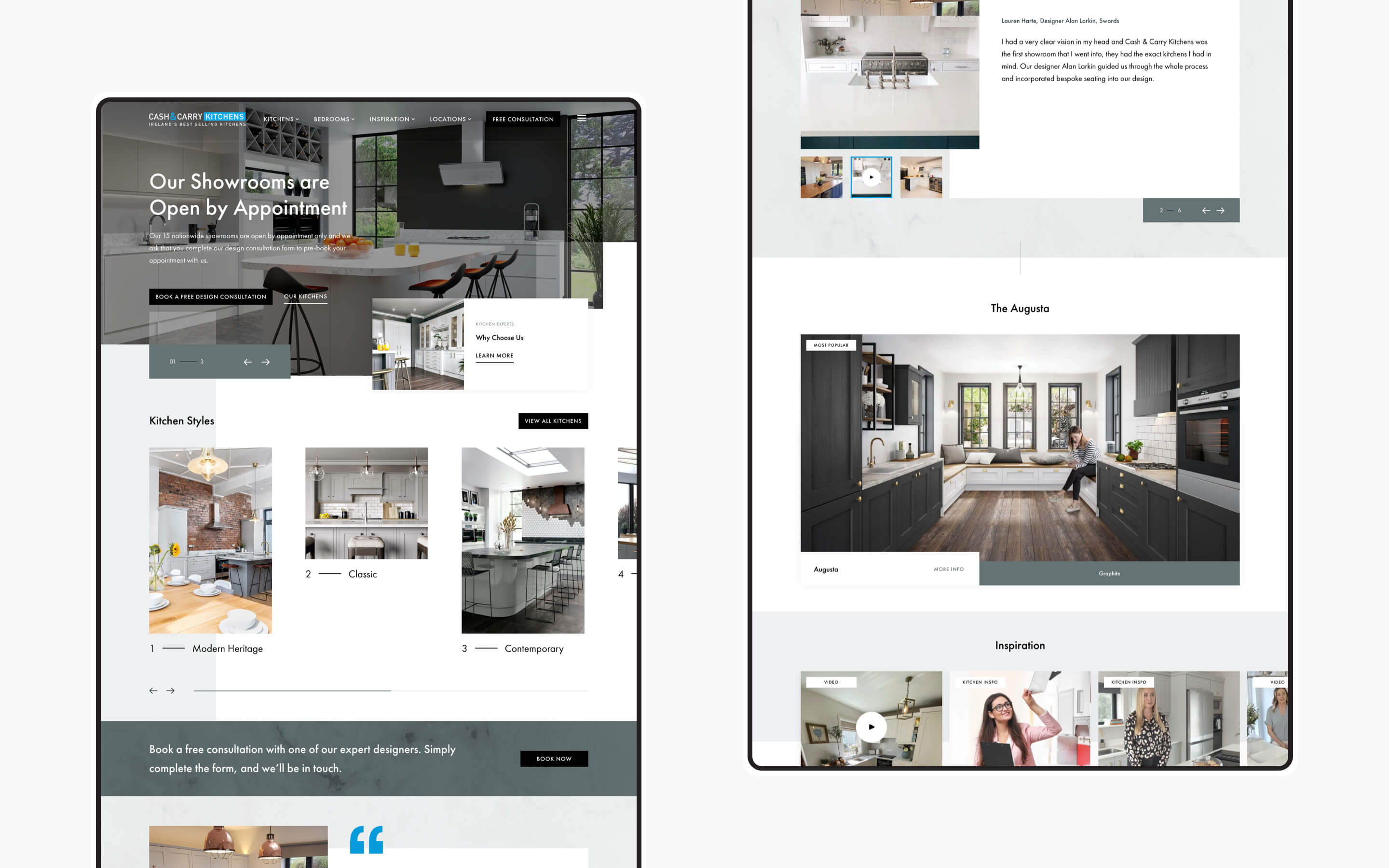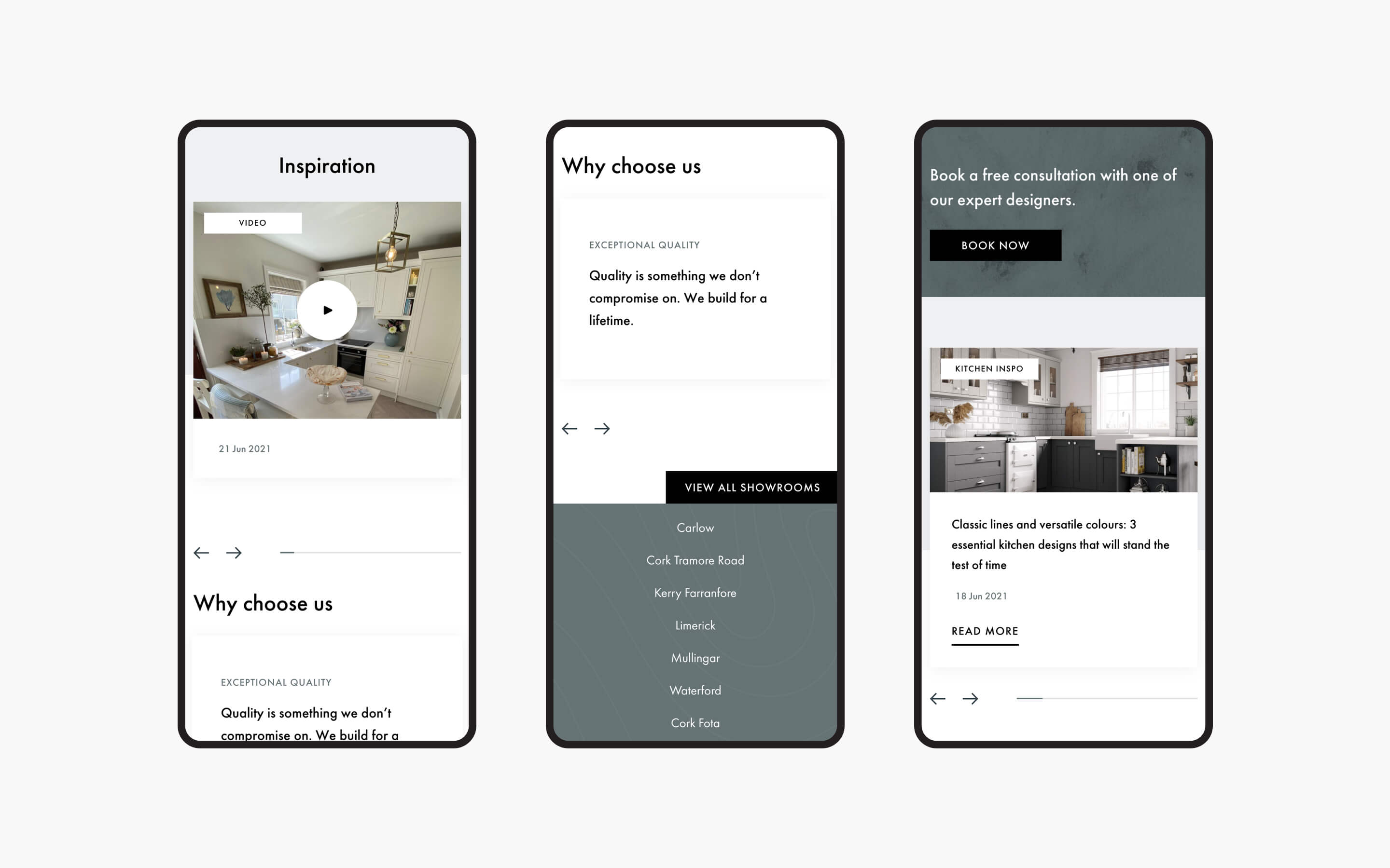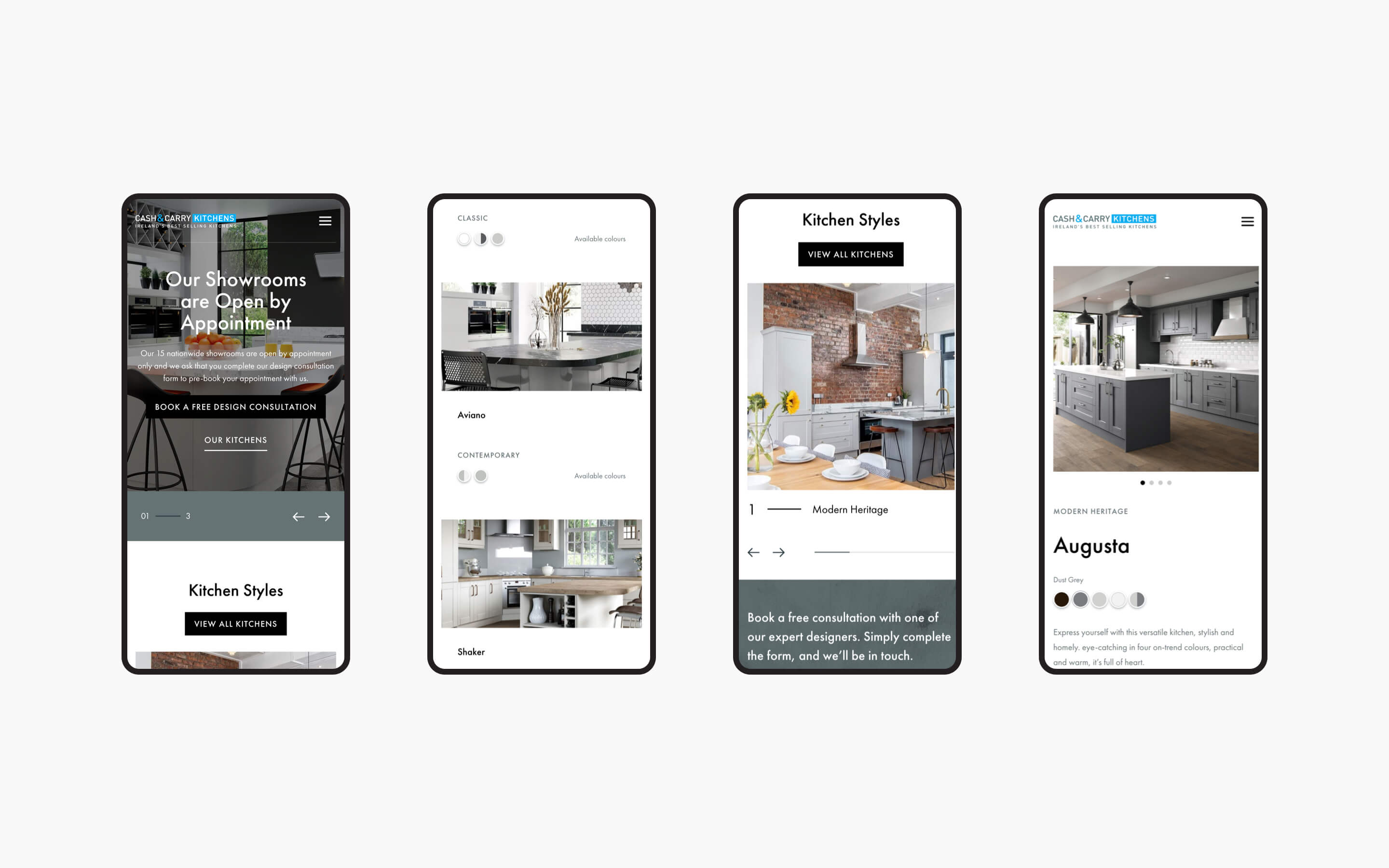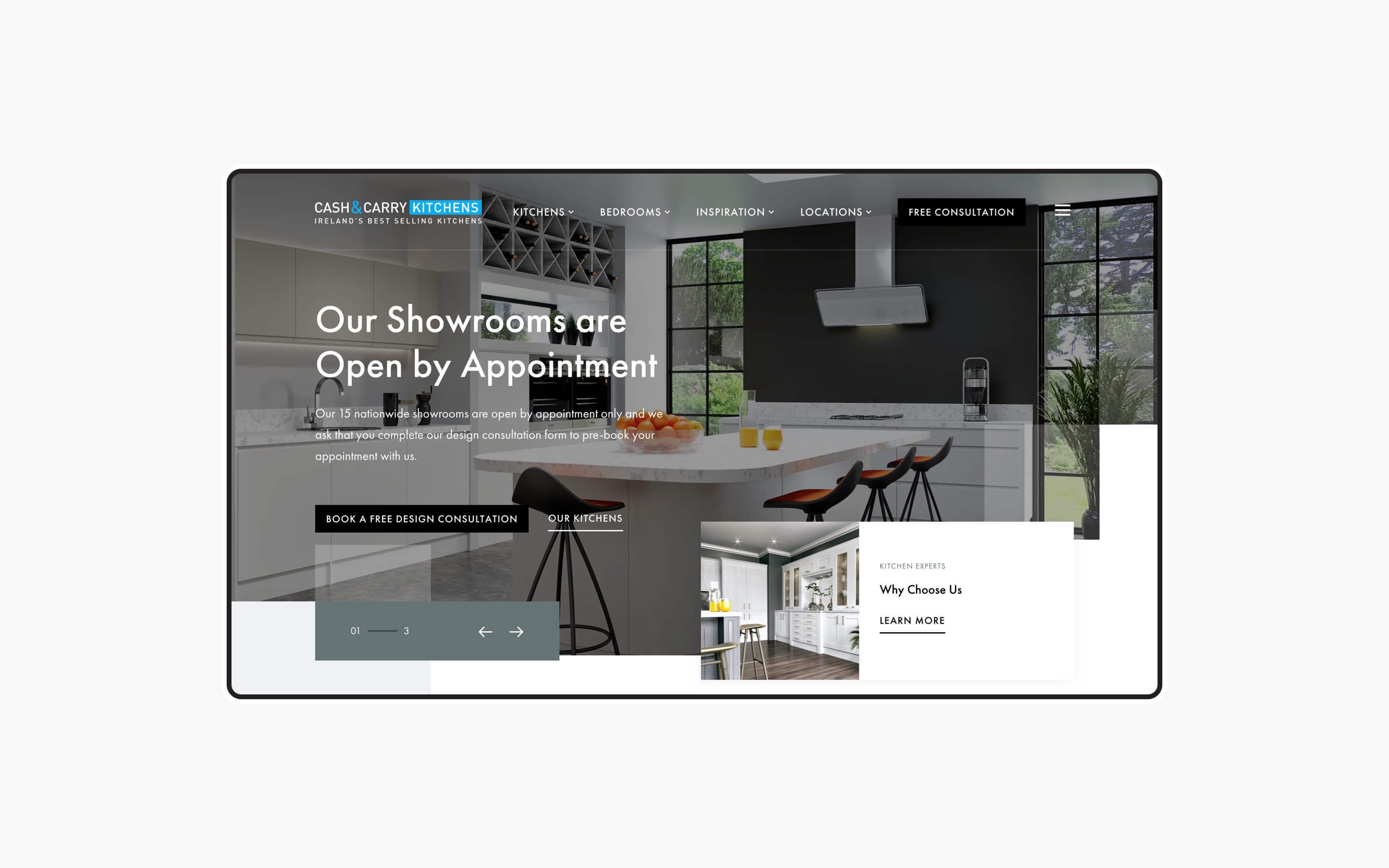 Given the target of increasing the conversion rate of customers on the site, Kooba needed to build a UX that reflected the needs of Cash & Carry’s clientele. Following an initial UX audit, several improvements were made by Kooba’s design team. Firstly, a prominent call to action (CTA) was featured on the homepage, inviting users to avail of a free consultation from Cash and Carry’s team. Secondly, card sorting workshops and user testing revealed the importance of clearly displaying Cash & Carry’s products in the header. By adding “Kitchens” and “Bedrooms” as pages, users could quickly find what they needed. This was further reinforced by the inclusion of imagery for each room offered, which helped display the quality and variety of Cash & Carry’s product range. These data-driven UX adjustments helped drive a significant increase in both lead generation and the website’s conversion rate.