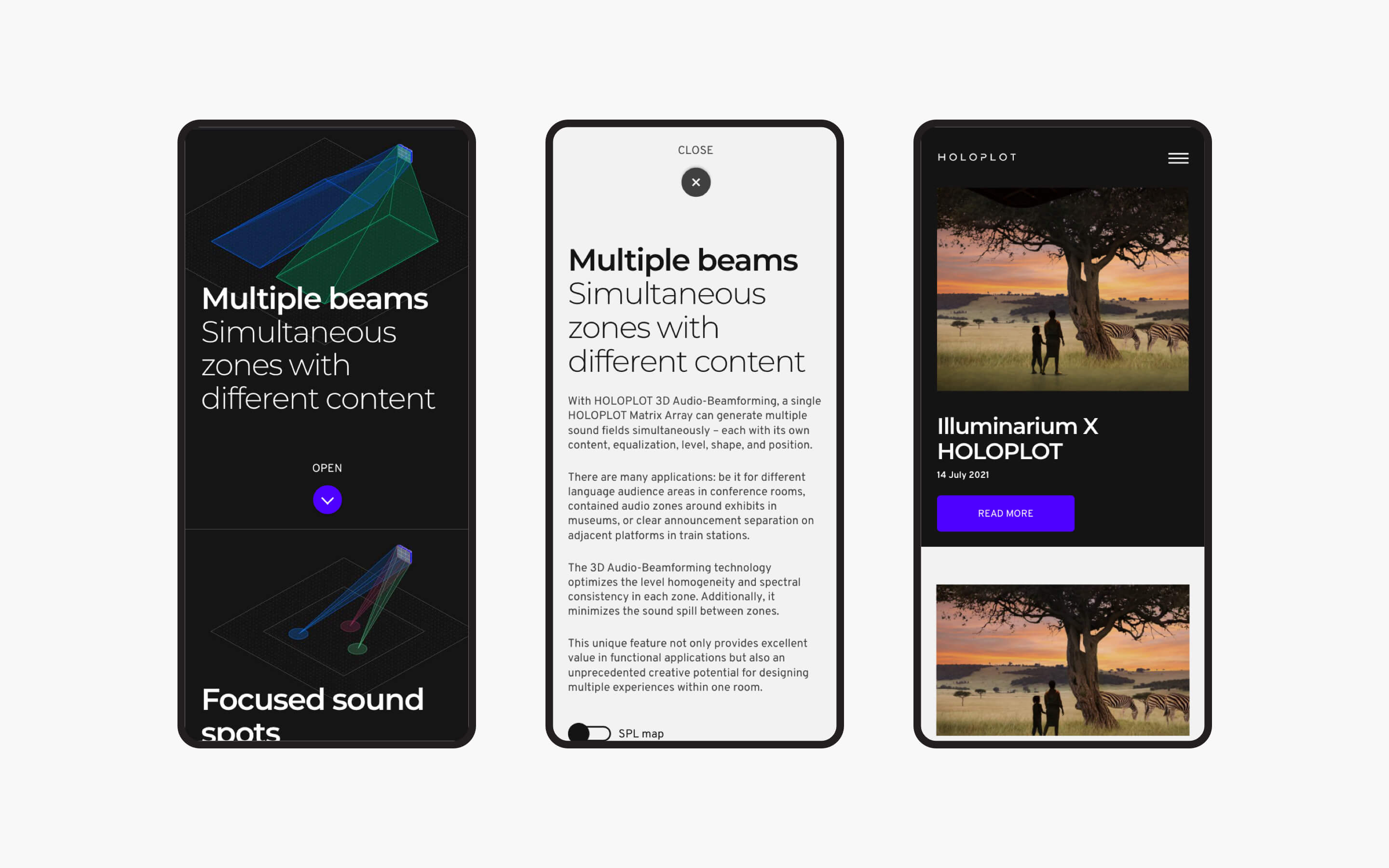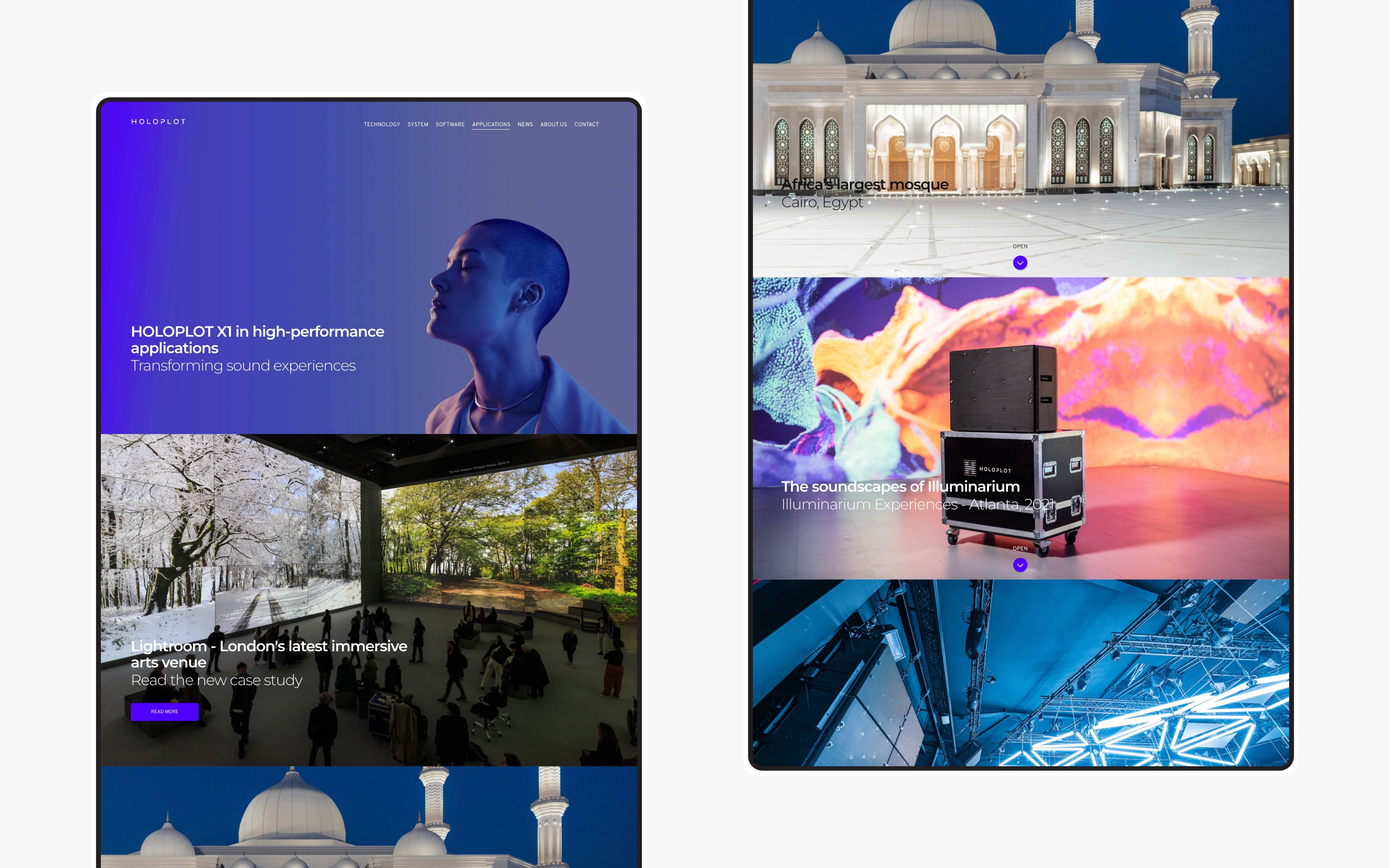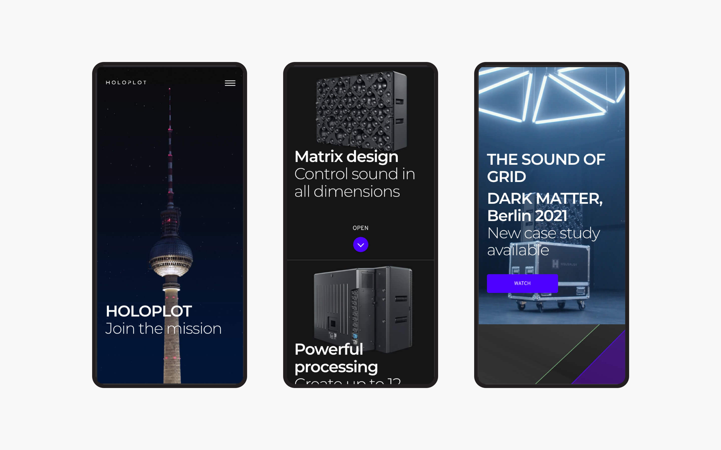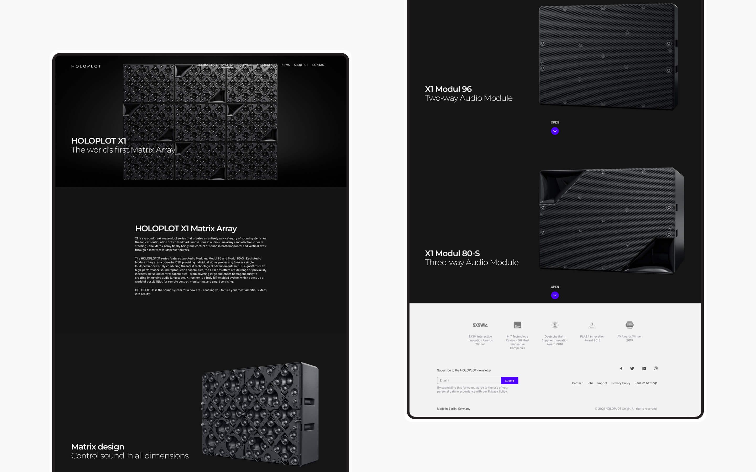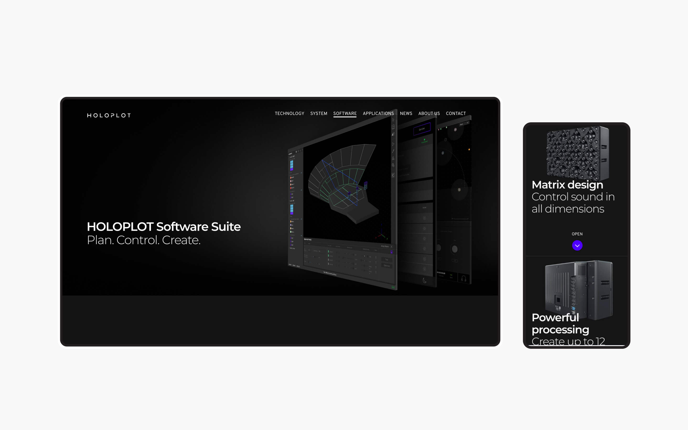 Holoplot's product gave us a special challenge: how do we visually capture the experience of sound? If explaining sound is tough, explaining immersive sound is even tougher. Holoplot creates immersive audio solutions that can only really be experienced in person: trying to represent audio in any other way than to explain this experience wouldn't have done the product justice. With this in mind, we wanted the website to be as immersive as this in-person audio experience. Therefore we took the simple approach of focusing on the product and what it can do. We let the large visuals speak for themselves and balanced this with equally large messaging.
