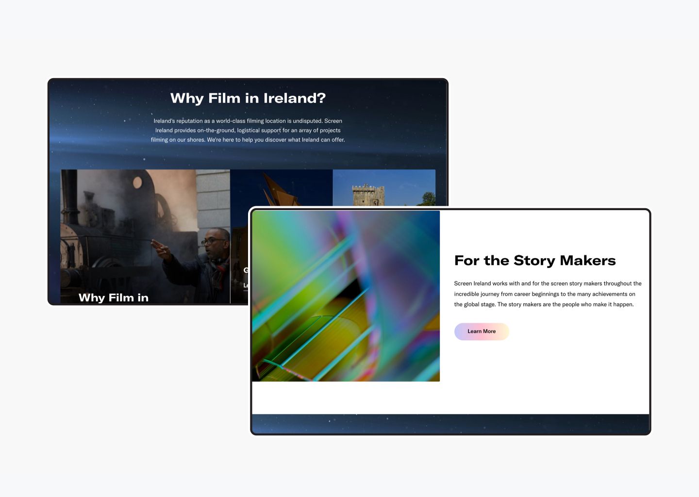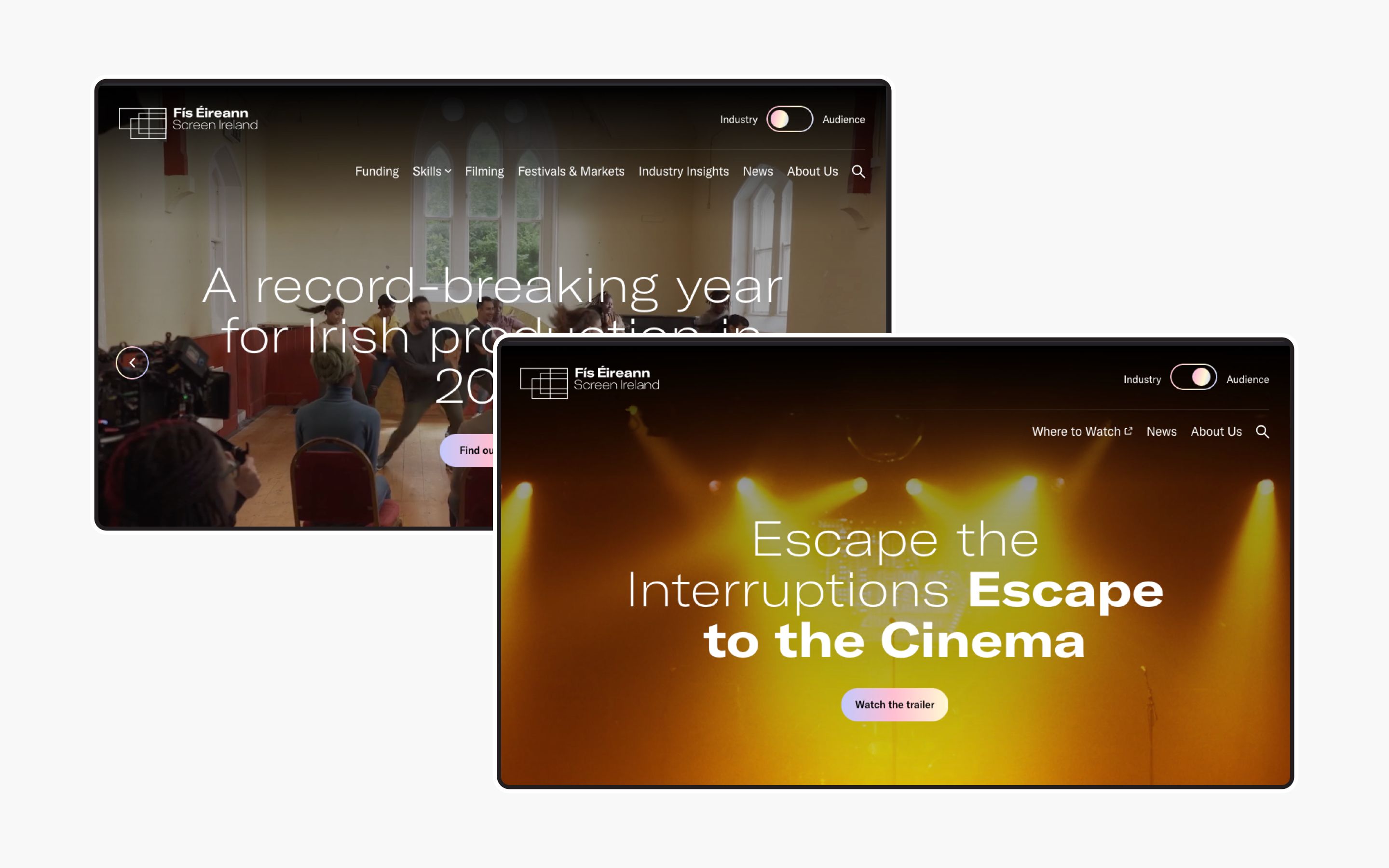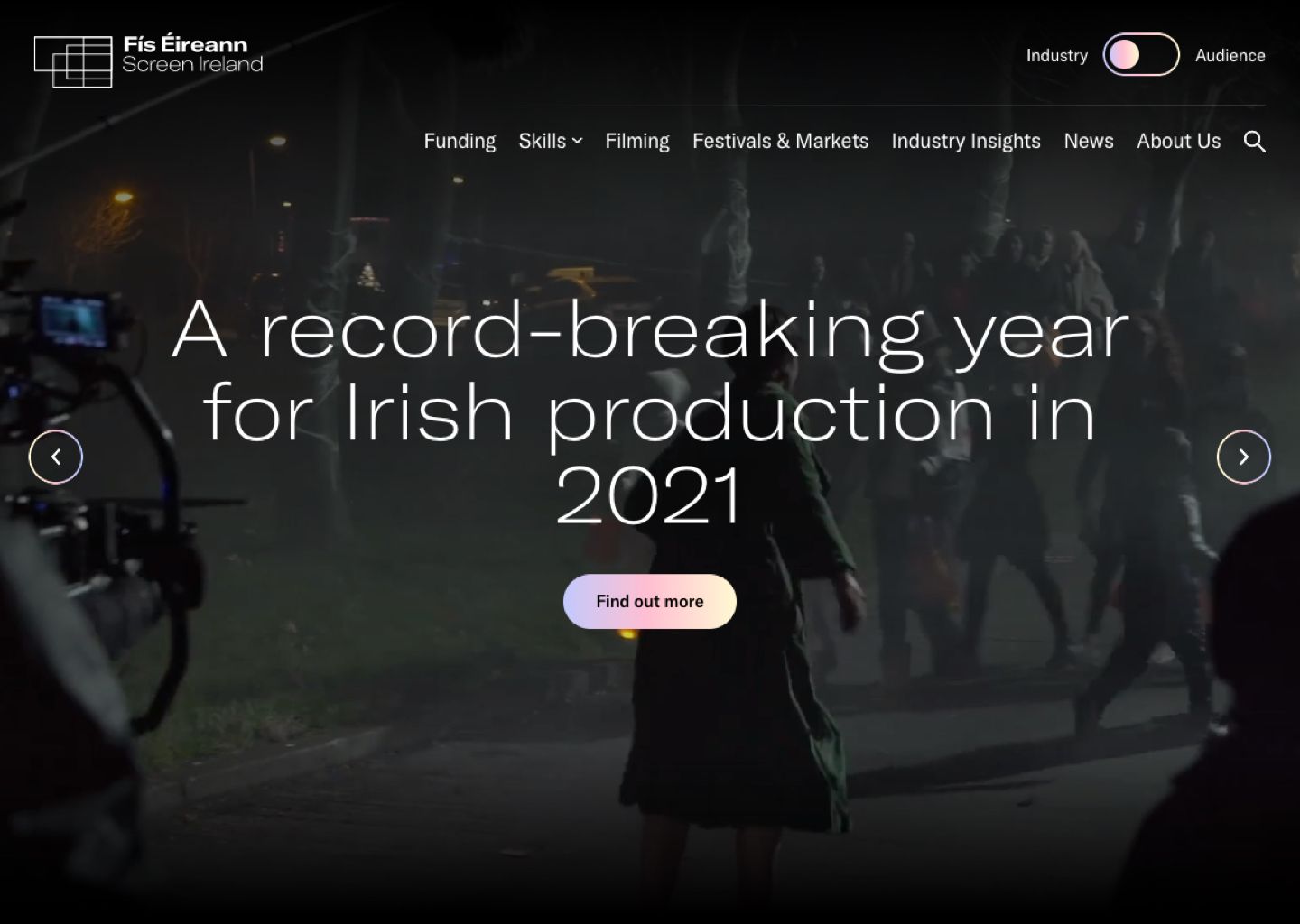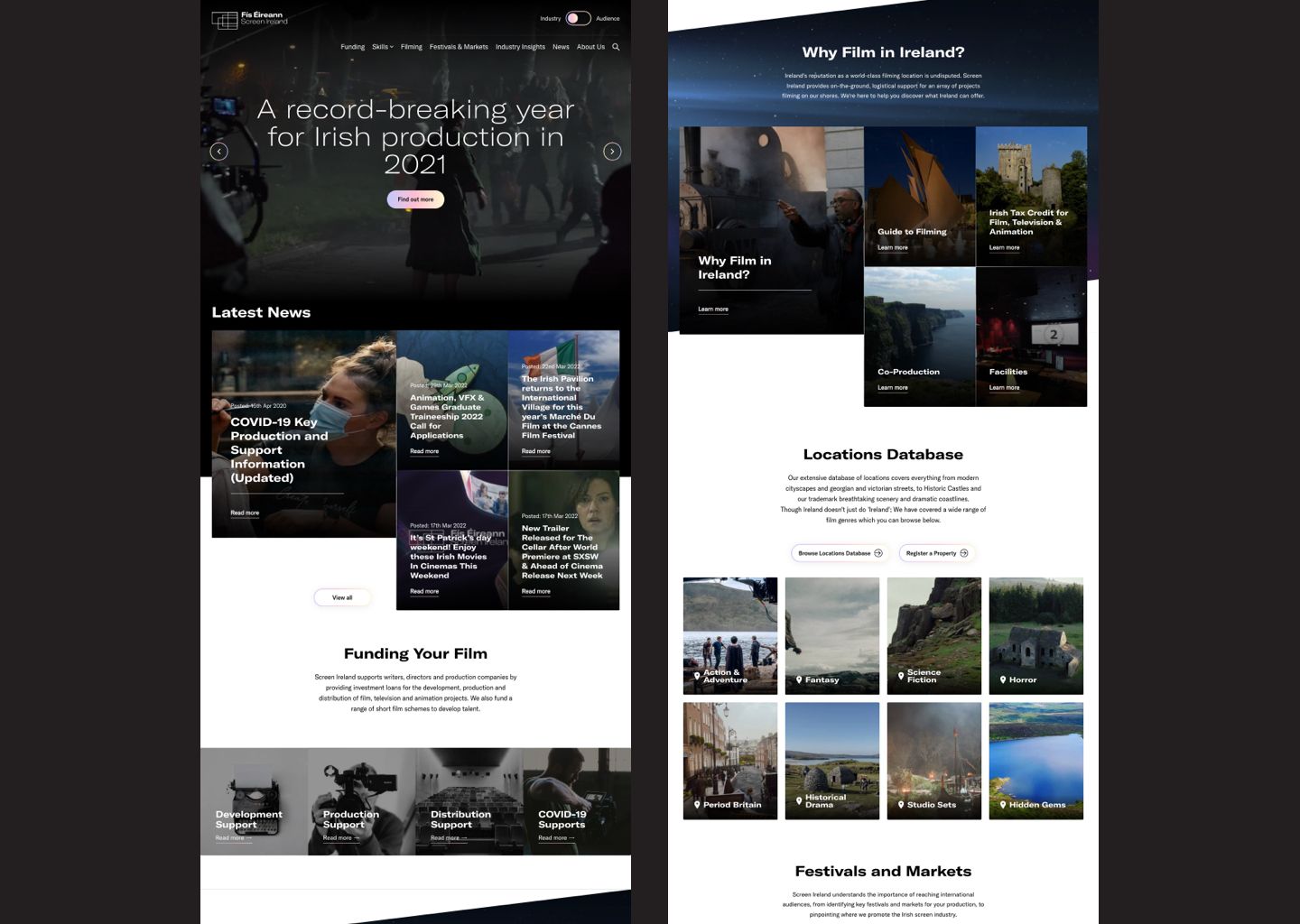The project introduced some technical complexities which required robust, creative solutions. Through the solution the Industry/Audience toggle we were able to effectively integrate two sites into one. Further to this, we needed to consider our approach to mixing old and new site elements. We wanted to ensure that the older Screen Ireland site elements, new Screen Ireland and Screen Skills elements and updated branding flowed across the site to enrich the user experience. Through a collaborative approach across all disciplines we were able to create a site that delivered on Screen Ireland/Screen Skills projects goals and objectives.