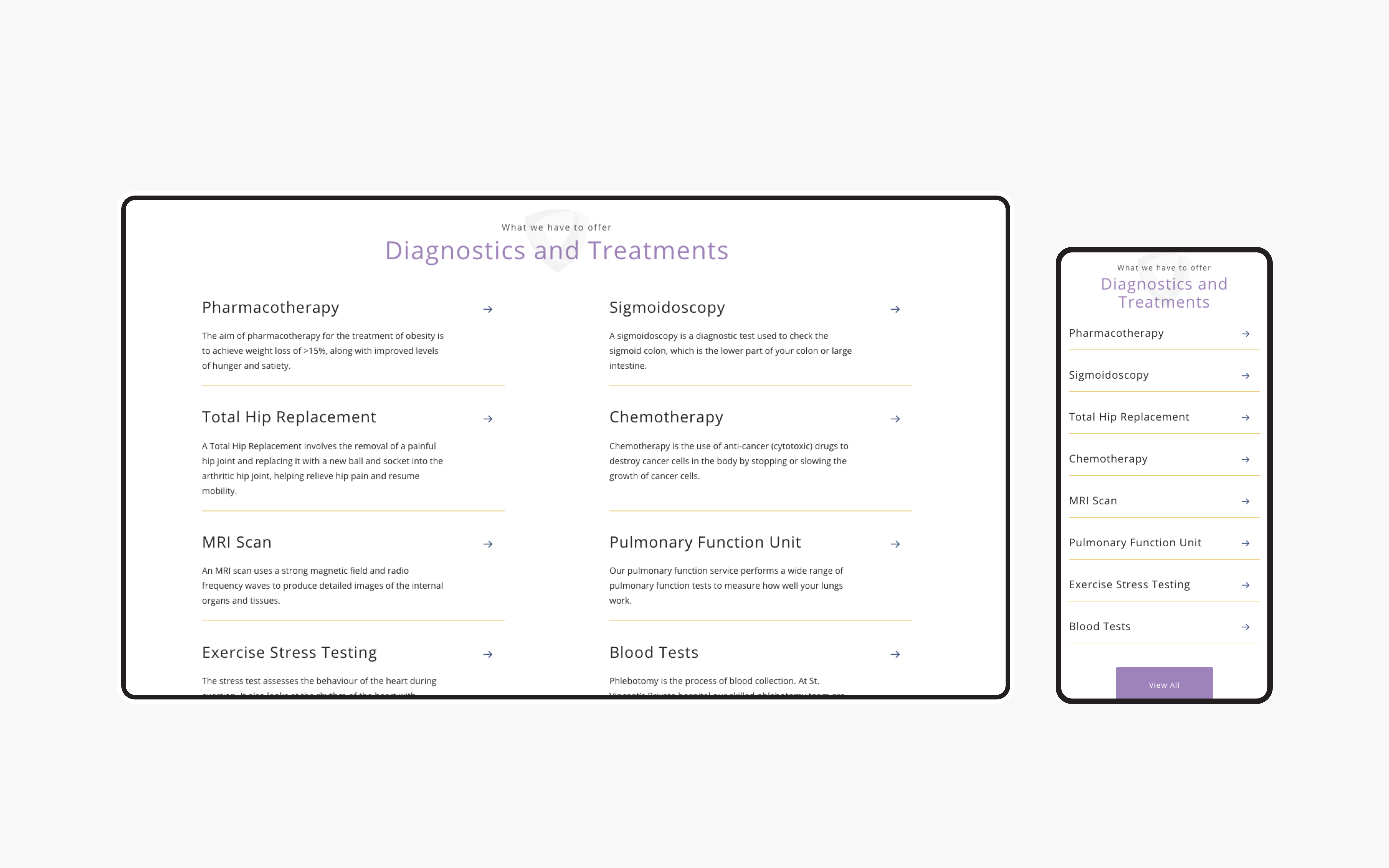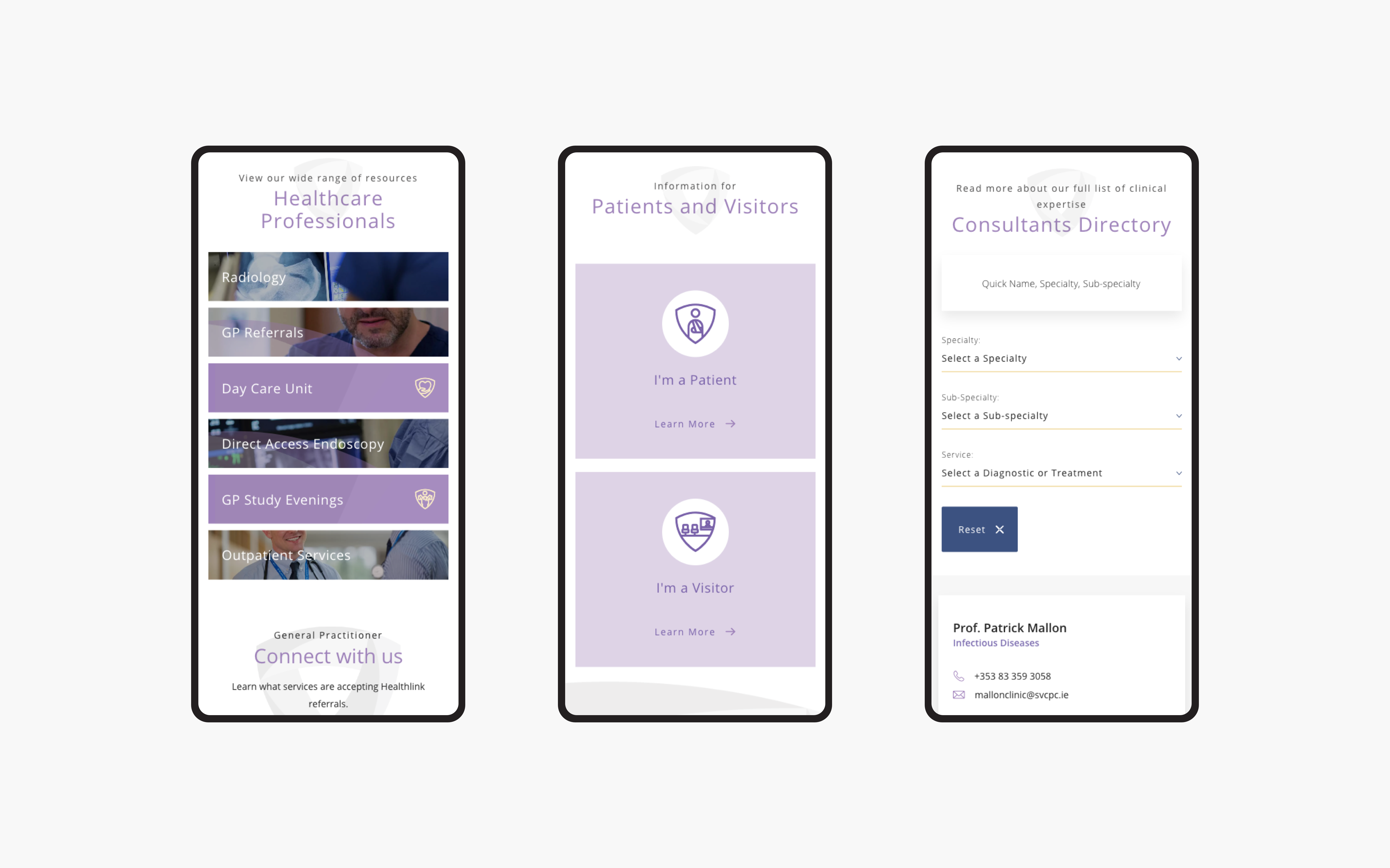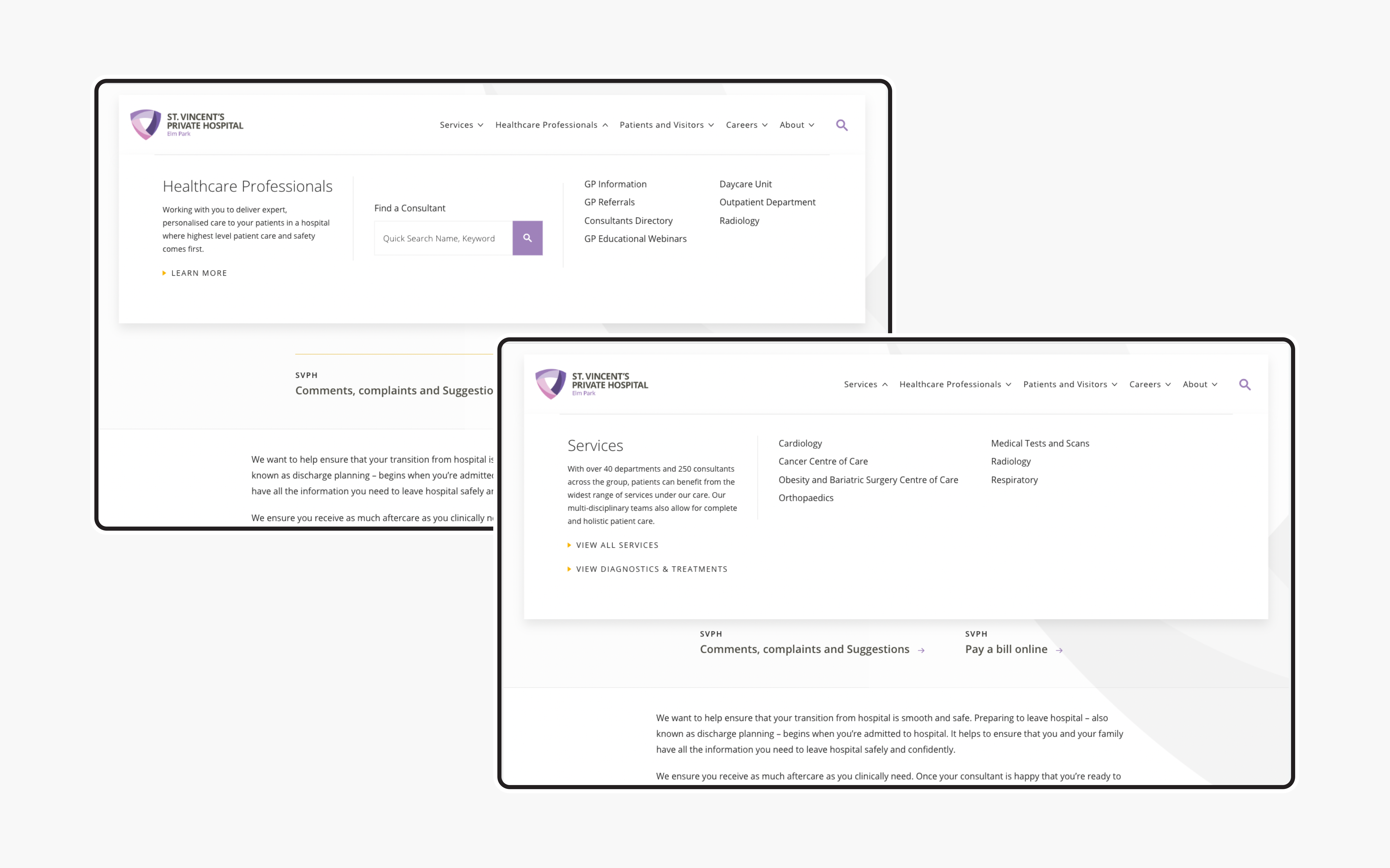 One of our findings within our UX review was the need for additional sections on the site. Although these sections didn't currently exist for St. Vincent's Private Hospital we felt they would add significant value for site users. We created content and feature specification, user flow analysis and design, wireframes and subsequent templates for 3 key sections: Centre of Care, Diagnostics and Treatments and Patients and Visitors. Each of these sections was made up of their own key content and helped users further drill down to their desired information in a matter of a few clicks.
