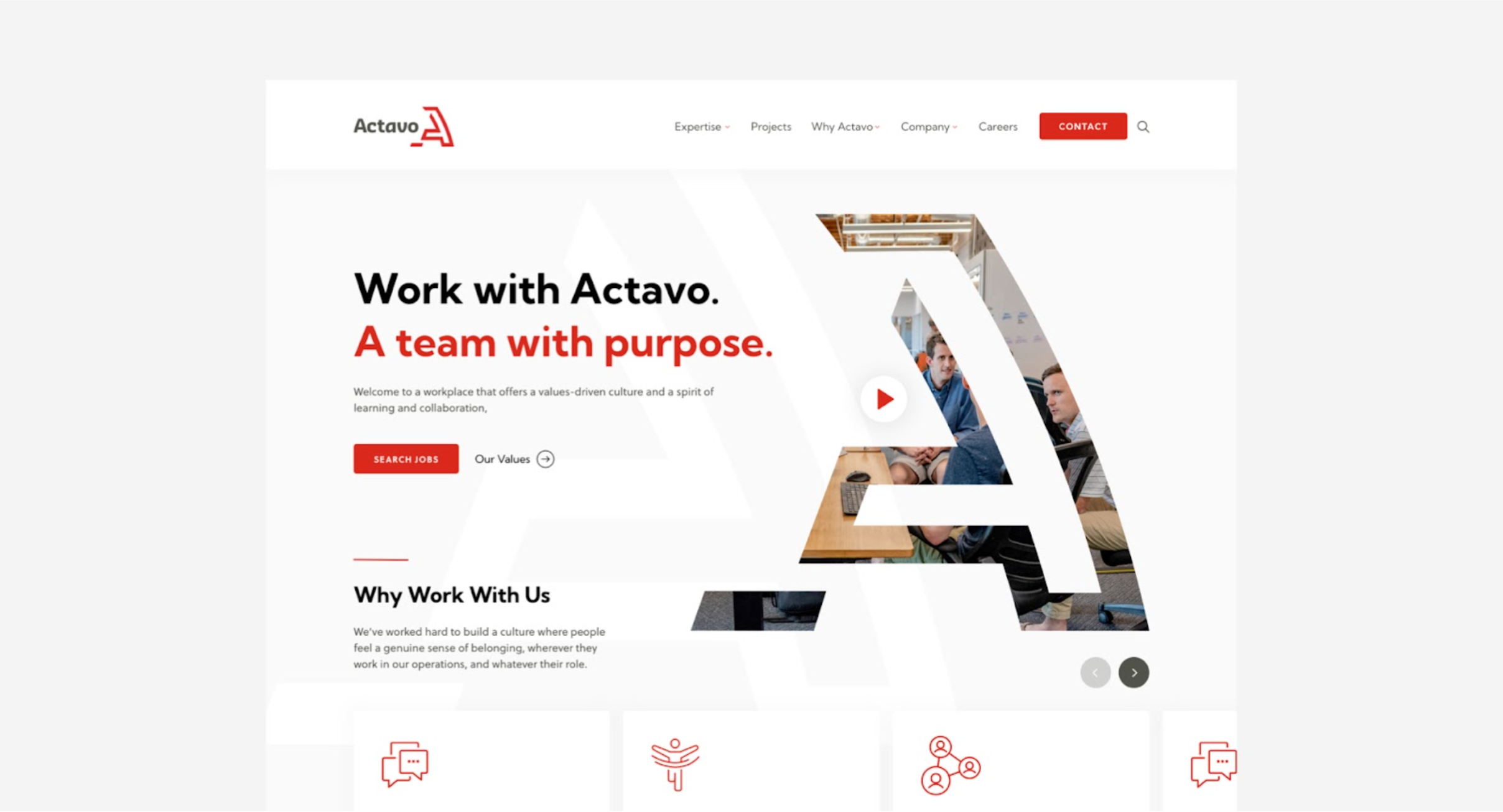 And negative space doesn’t have to be completely white either. It’s simply empty space (that could be patterned or another colour) that makes way for other elements to be highlighted. Take Actavo, whose priority was to highlight their team environment in a quick and snappy way.
