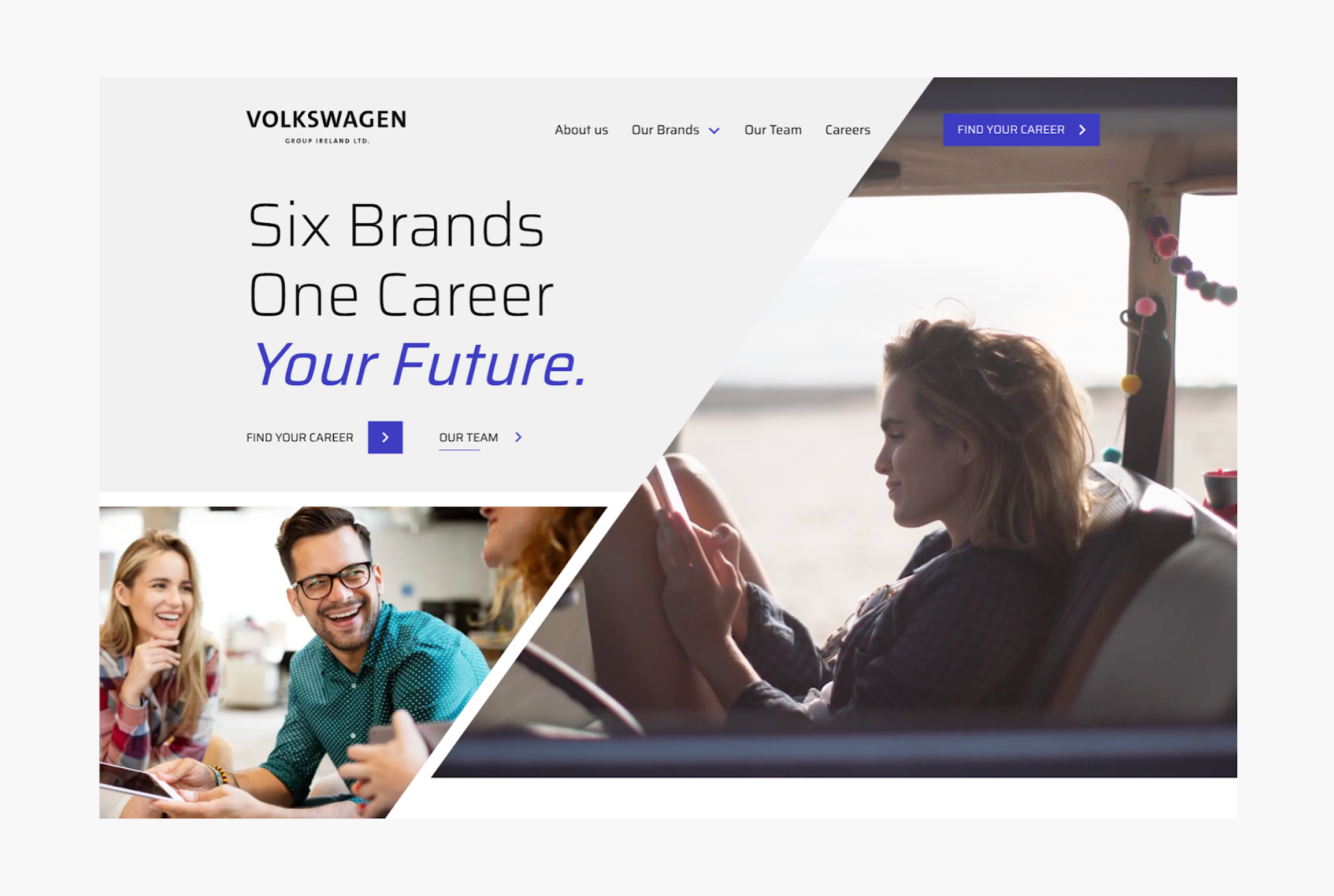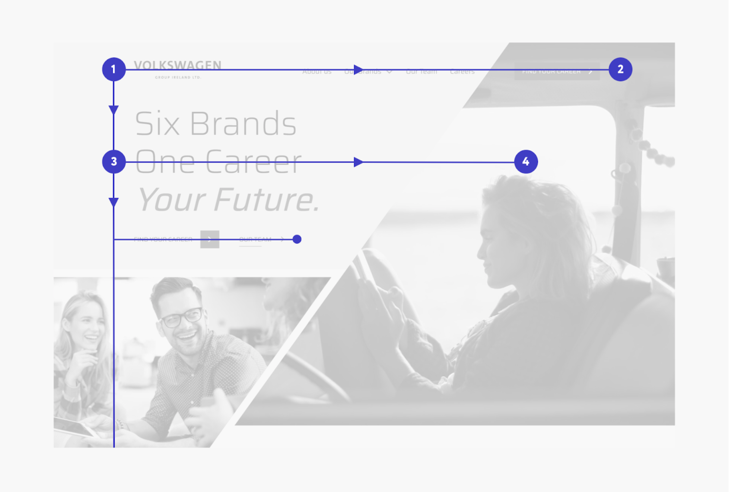 We designed the Volkswagen Careers site to follow the “F” pattern, starting with the logo at the top left. Then the user scans right towards their priority: finding their career. Next, the header text is bold, slightly shorter than the length of the navigation bar, and sets up the purpose of the site. Finally, the user’s eyes land on the ‘Find your career’ CTA, guiding the user to view live job listings. All the important information Volkswagen wanted to highlight falls in the path of the site visitor. Users are probably already scanning your site in an “F” pattern – give them something to land on.