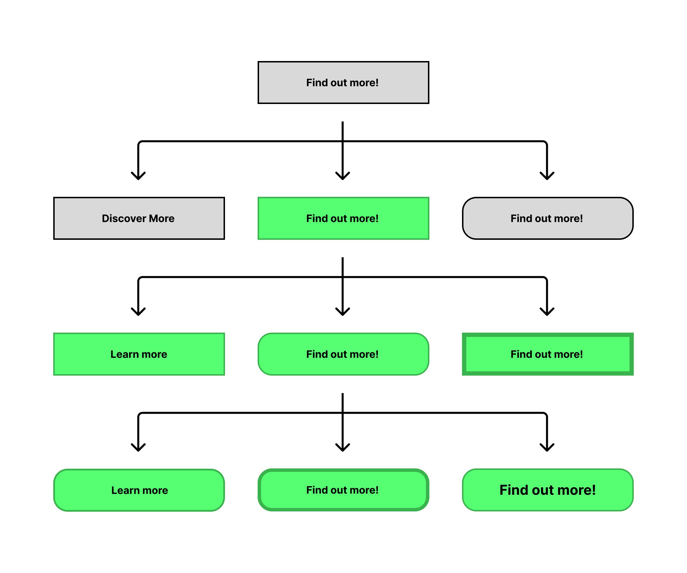 As this illustration shows, the elements of a feature are gradually refined as the testing process progresses. For instance, the green palette tested well in the first stage, so the second stage focuses on iterations of that variant. Then, in turn, the curved shape does better, so variants with a green palette and a curved shape are tested. In theory, this process can go on forever, and is only limited by the resources available to the UX team and the rate of conversion needed by the feature in question.