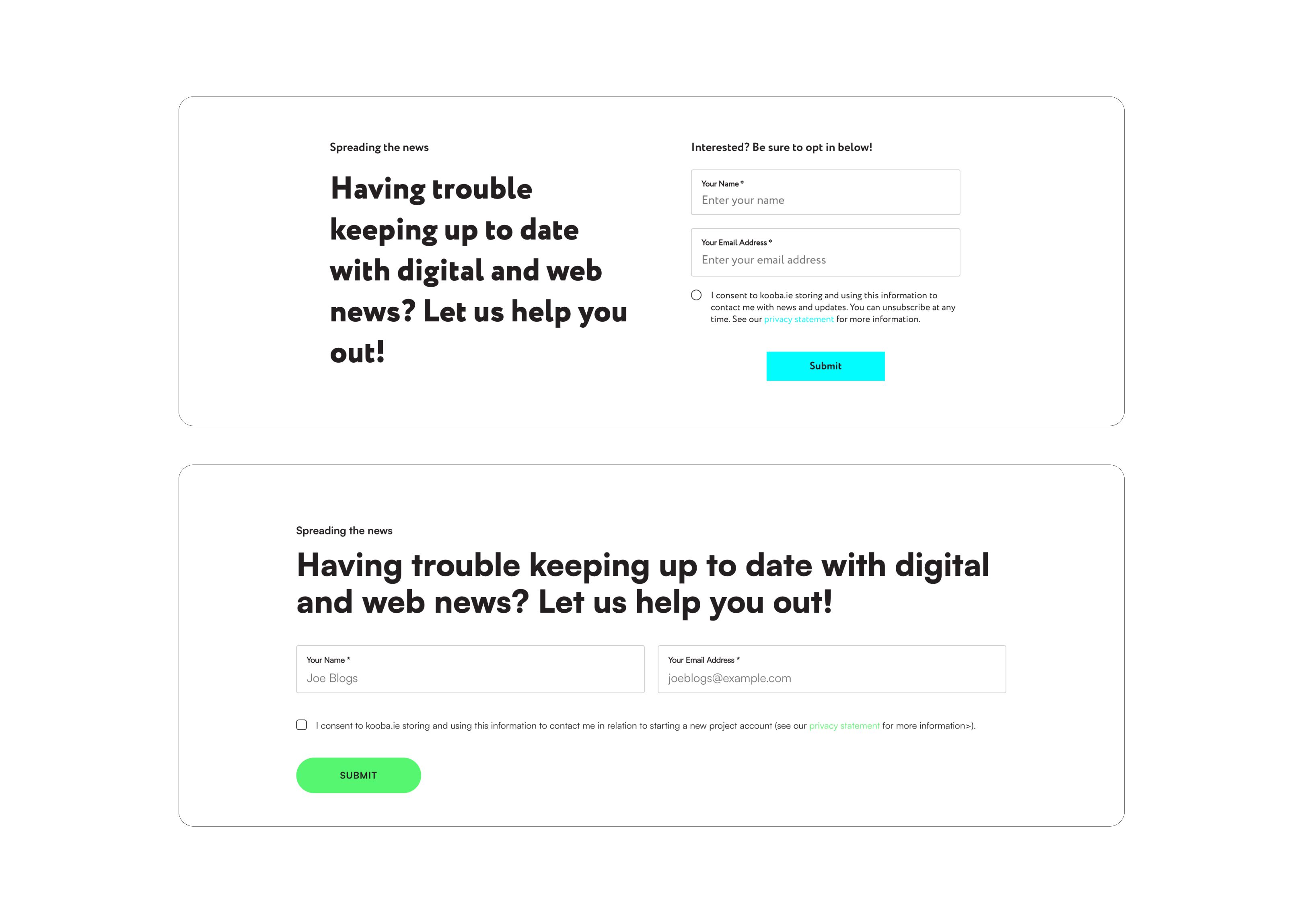 Of course, CRO can be used for far more than just CTA buttons. One classic example of CRO in action is with landing pages, for which a wide variety can be produced and tested throughout the course of a lead-gen campaign. CRO is a process that can be applied almost anywhere, provided that you can create variations of a testable feature. Take for instance a case from the Kooba website, where we tested and then implemented an improved newsletter sign-up form to reach a higher conversion rate.
