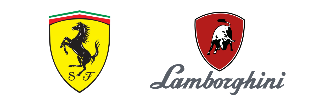 Ferrari and Lamborghini logos. Note the letters S.F. for "scuderia ferrari" - literally Ferrari stables.