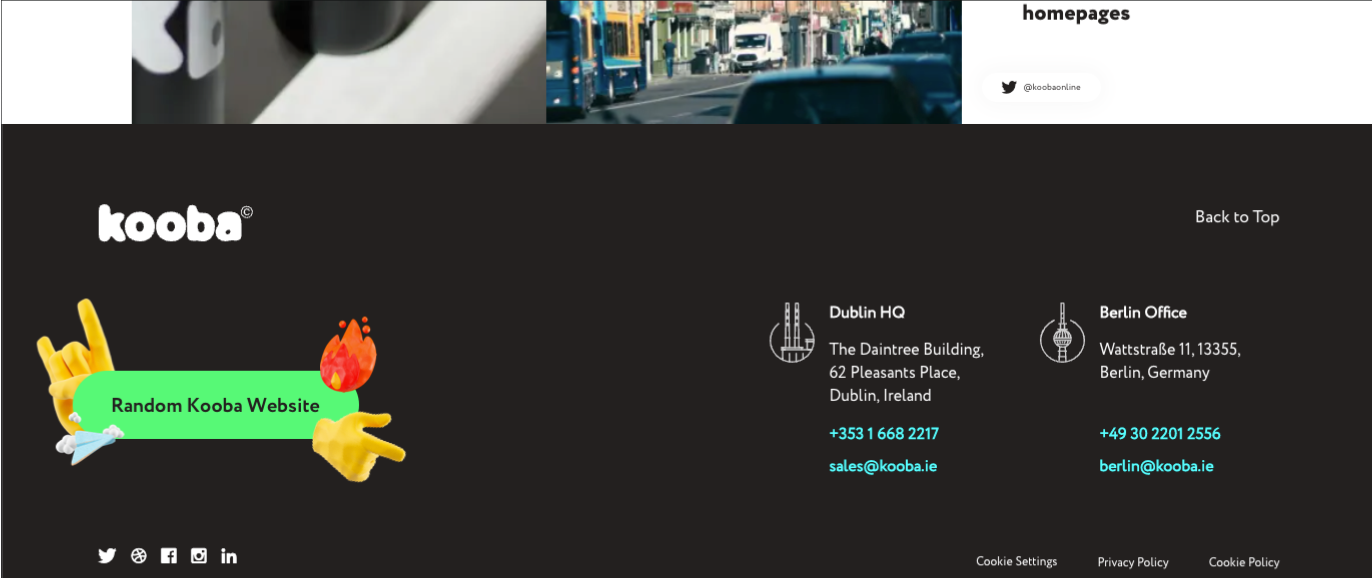 At the footer of Kooba.ie, there will be a Randomiser button that brings you to a random Kooba website that we have designed and built. Rolling over the button activates 3D emojis!
