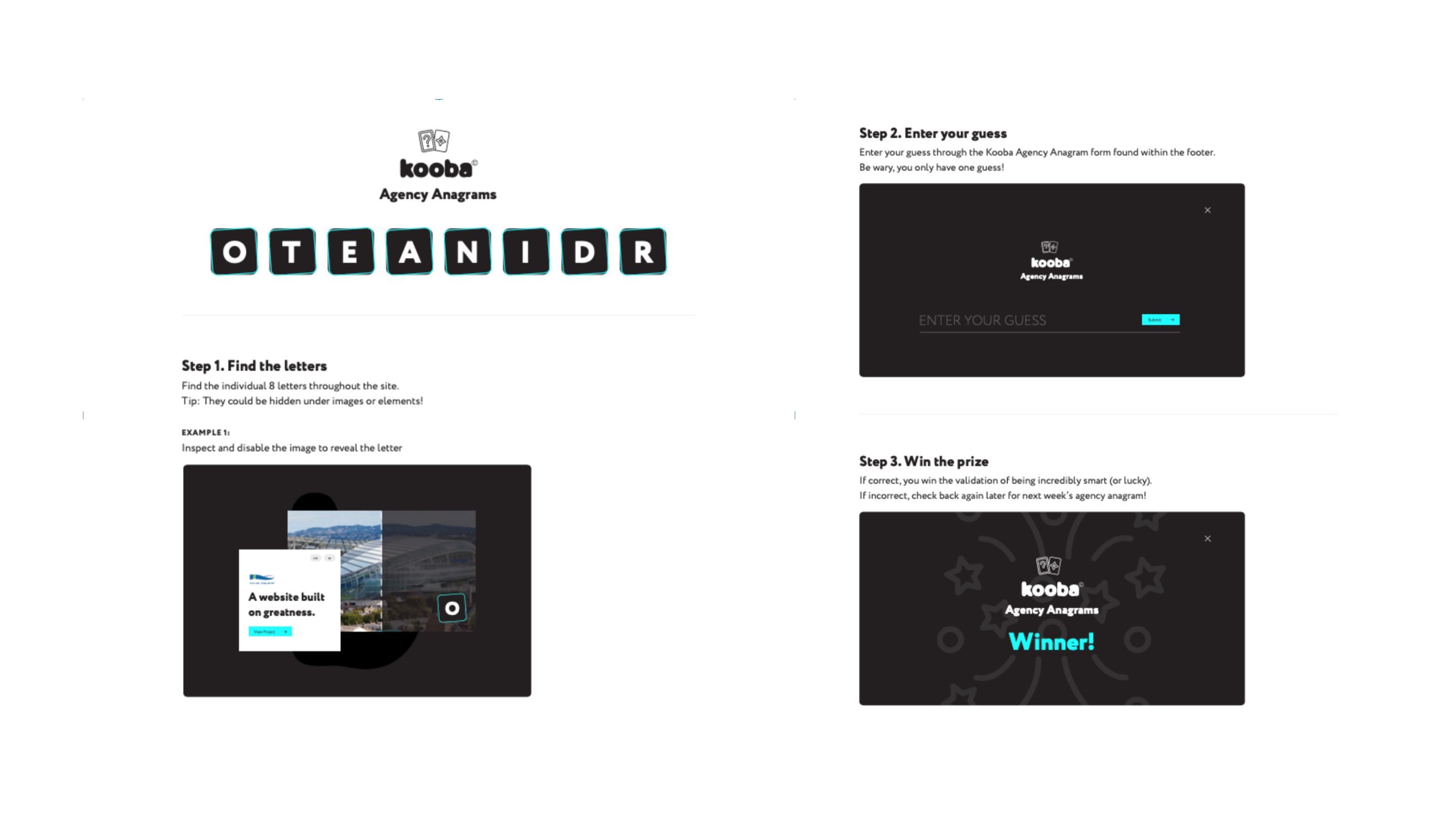 Play Kooba’s version of Wordle – Agency Anagrams. When the challenge begins, users can visit Kooba.ie and reveal the letters by hunting around the site. Then, users can enter their guess through the Agency Anagrams form. Find the letters. Enter your guess. Win the prize.