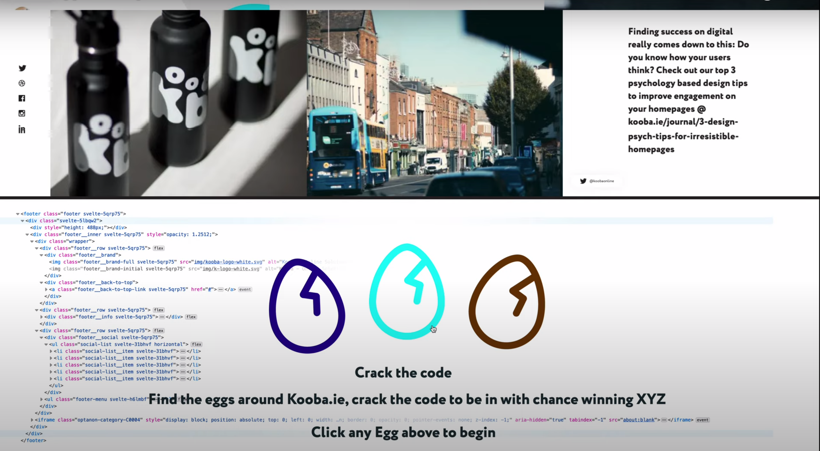 After the user is prompted from our socials, they’ll land on Kooba.ie. By interacting with a scissor icon, the user can cut the footer to reveal the challenge. ‘Crack the code. Find the eggs around Kooba.ie, crack the code to be in with chance to win XYZ’. Each egg contains the letters you’ll need. Find the eggs and crack the code.