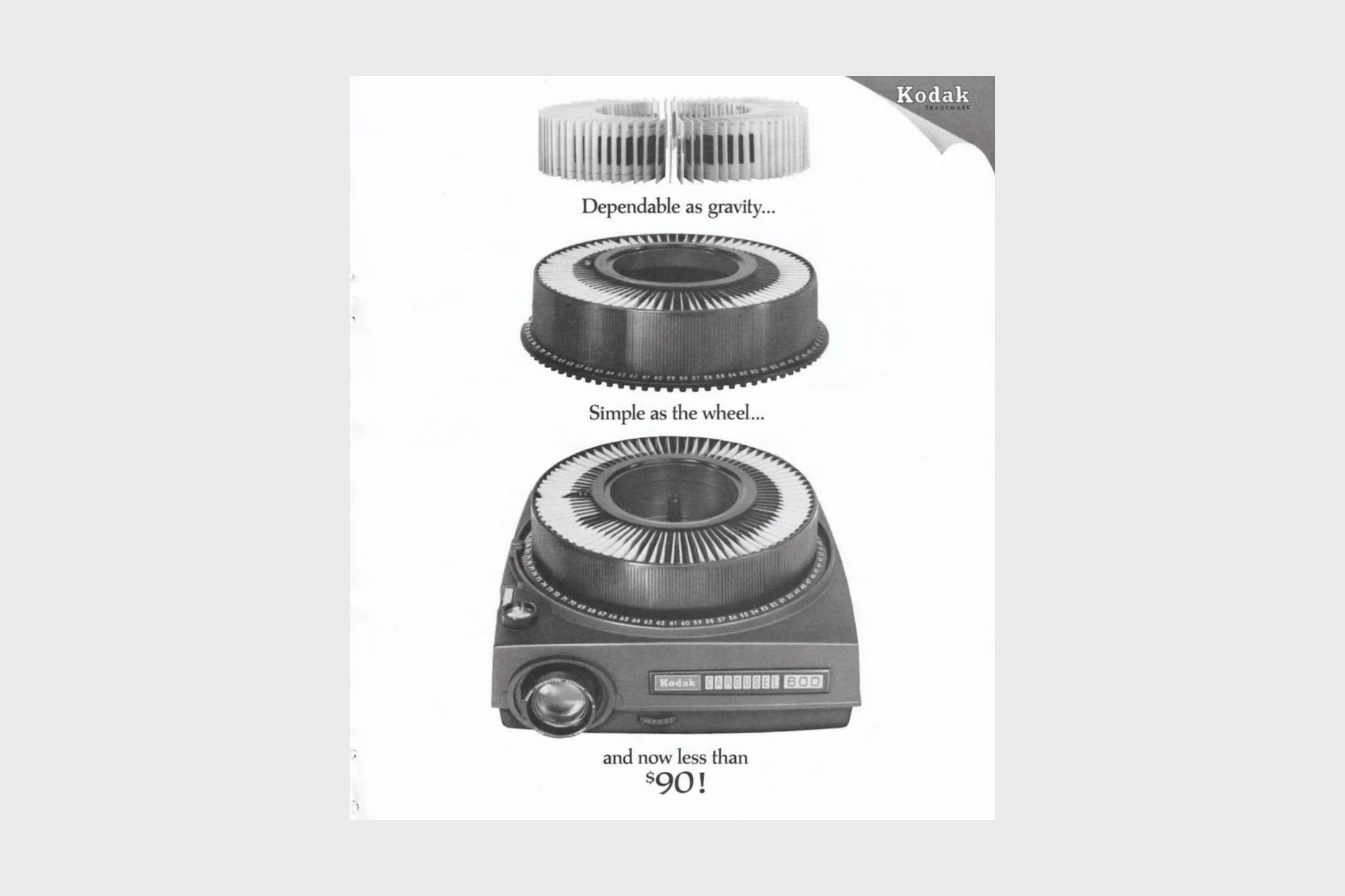 And as the wheel loudly shifts one picture to another, he turns logic to emotion. He says to his audience, ‘It’s not a wheel’, taking attention away from the feature. After a long breath, he says ‘It’s a carousel,’ a symbol of childhood, a carefree, neverending ride. That’s the benefit of buying from Kodak: nostalgia that people won’t admit they crave.